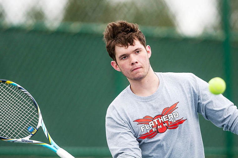 Flathead senior Connor Roetigg eyes the ball as he prepares to return a serve Saturday afternoon during his No. 1 singles match against C.M. Russell’s Asad Khattak at Flathead Valley Community College. Khattak won 7-5, 7-5.