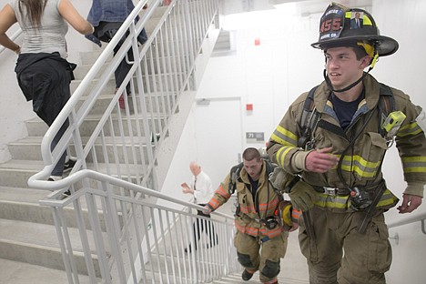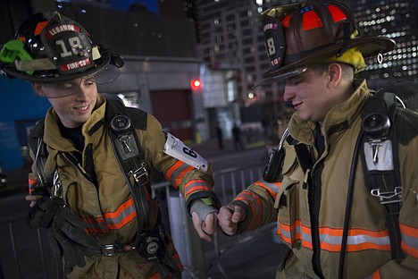 "We do it as a tribute" to those who were lost in the Sept. 11 attacks, said Sean Smith, 22, who said he was wearing 68 pounds of equipment. He has been a firefighter for five years in Lebanon, N.J.