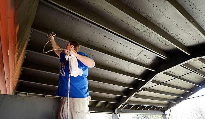 Matt Stone, store manager at Sherwin-Williams, gives a new two-toned paint job to the pavilion at Lions Park on Tuesday, April 8, in Kalispell. (Brenda Ahearn/Daily Inter Lake)