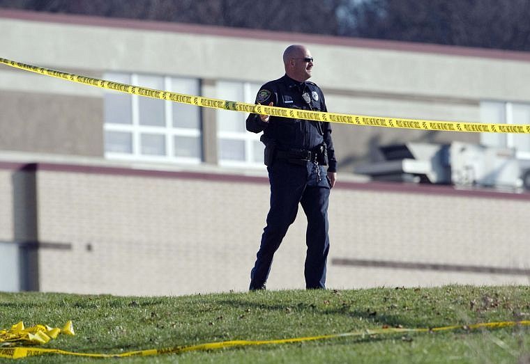 A police officer stands by the scene outside Franklin Regional High School where 20 were stabbed by a knife wielding suspect on Wednesday, (AP Photo)