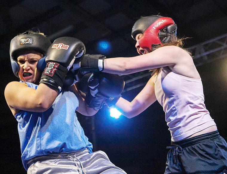 Flathead’s Ashlie Wise (right) lands a punch on Columbia Falls’ Krystan Jones Thursday night during the fifth annual Crosstown Smoker at the Flathead County Fairgrounds Trade Center. Wise won by unanimous decision. (Patrick Cote/Daily Inter Lake)