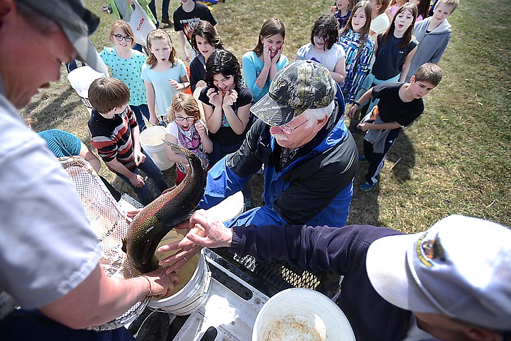 Jim Vashro, a volunteer, helps load Arlee Rainbow Trout into buckets for the Hedges Elementary 4th graders on Thursday afternoon, April 10, at Dry Bridge Park in Kalispell. Approximately 2000 fish were released into the pond from three hatcheries: the Creston National Fish Hatchery, the Murray Springs Trout Hatchery in Eureka, and the Jocko River Trout Hatchery in Arlee. (Brenda Ahearn/Daily Inter Lake)