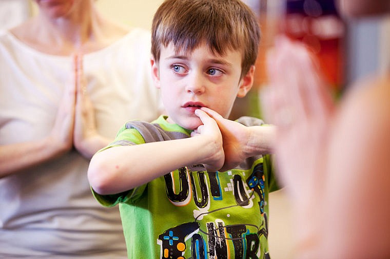Travis Steffler, 5, puts his hands together during a yoga session Thursday afternoon at the Child Development Center in Evergreen. (Patrick Cote/Daily Inter Lake)