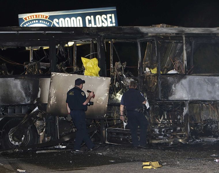 Explosions of orange flames engulfed both vehicles, and clouds of black smoke billowed into the sky until firefighters doused the fire, leaving behind scorched black hulks of metal. Bodies were draped in blankets inside the burned-out bus.