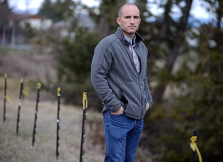 Homeowner Scott Gearhart stands along a section of the bluff marked by stakes used to track the rate of ground movement on Wednesday, April 9, in Evergreen. (Brenda Ahearn/Daily Inter Lake)