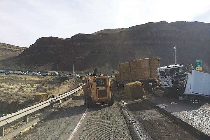 About 7:30 a.m., a white 2008 Kenworth semi-truck loaded with hay struck a street sweeper parked behind an asphalt grinder in a coned-off construction area near the Vantage Bridge, where crews are repaving about 11 miles of road. The street sweeper, which was unoccupied, was then pushed into an asphalt grinder, according to information from the Washington State Patrol.