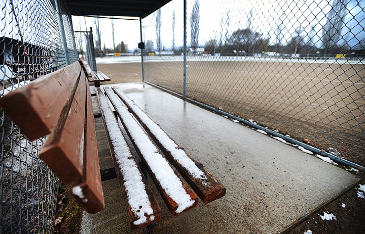 Snow lightly covers the benches in the dugout at the Conrad Complex Saturday morning. Sporting events around the Flathead Valley were either postponed, or not completed, because of the weather. Flathead’s softball games with Great Falls C.M. Russell and Great Falls High at the Conrad Complex were canceled.