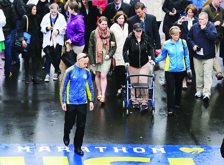 After the tributes, many of those in attendance walked in the rain to the finish line for a moment of silence that coincided with the time when the bombs went off. Bells rang, and a flag was raised by transit agency police Officer Richard Donohue, who was badly injured during a shootout with the bombing suspects.