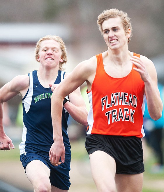 Flathead’s Chance Kittle and Glacier’s Brock Sandry battle it out during the 1600-meter run Tuesday afternoon at Legends Stadium. Kittle edged Sandry by .01 seconds for second place. (Patrick Cote/Daily Inter Lake)