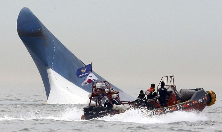 Local television stations broadcast live pictures of the ship, Sewol, listing to its side and slowly sinking as passengers jumped out or were winched up by helicopters. At least 87 vessels and 18 aircraft swarmed around the stricken ship. Rescuers clambered over its sides, pulling out passengers wearing orange life jackets. But the ship overturned completely and continued to sink slowly. Within a few hours only its blue-and-white bow stuck out of the water.