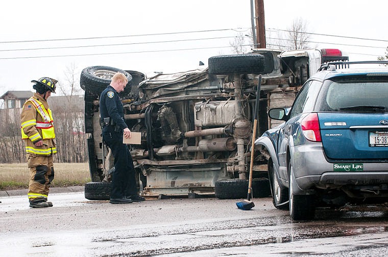 Kalispell Police Department's Jason Parce and Kalispell Fire Department firefighter Doug Schwartz, left, inspect the scene of two-vehicle crash that left a truck on its side Thursday afternoon on U.S. 93 in front of Flathead Valley Community College. April 17, 2014 in Kalispell, Montana. (Patrick Cote/Daily Inter Lake)