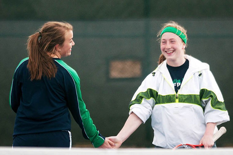 Glacier's Kayla Harwood (left) and Kali Matheson slap hands after a point Friday afternoon during a crosstown tennis match between Glacier and Flathead at Flathead Valley Community Collge. April 18, 2014 in Kalispell, Montana. (Patrick Cote/Daily Inter Lake)