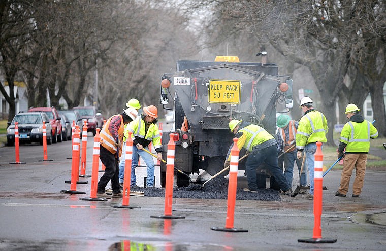 Kalispell street workers perform road maintenance Thursday on First Avenue East near Fifth Street. Work on both First Avenue East and First Avenue West is expected to continue until May 16. Motorists should expect short delays with single-lane and one-block street closures.
