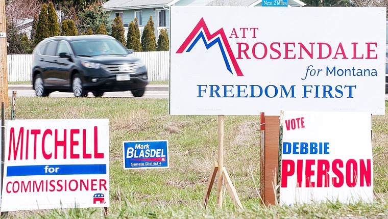 Vehicles drive past campaign signs posted along the north side of Reserve Drive near Whitefish Stage Road at the edge of Kalispell.