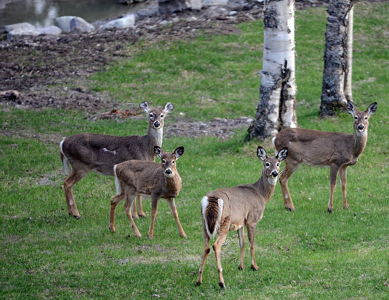 A quartet of white-tailed deer pauses as they forage for their dinner on Monday in Whitefish.