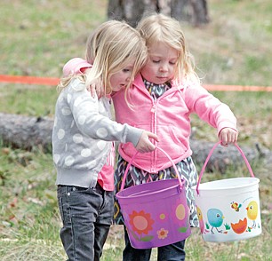 Easter cousins Macy Foss, left, and Sofie Albiero compare baskets Saturday at J. Neils Park during Youth Court Serivces' 13th Annual Easter Egg Hunt. The event included 150-dozen colored eggs and 250 prizes for each of four age groups, walking through 12.