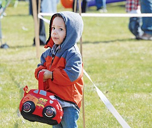 Zahmann Sykes, 2, of Libby waits with his Easter basket Saturday before the start of the Troy Easter Egg Hunt at Roosevelt Park.
