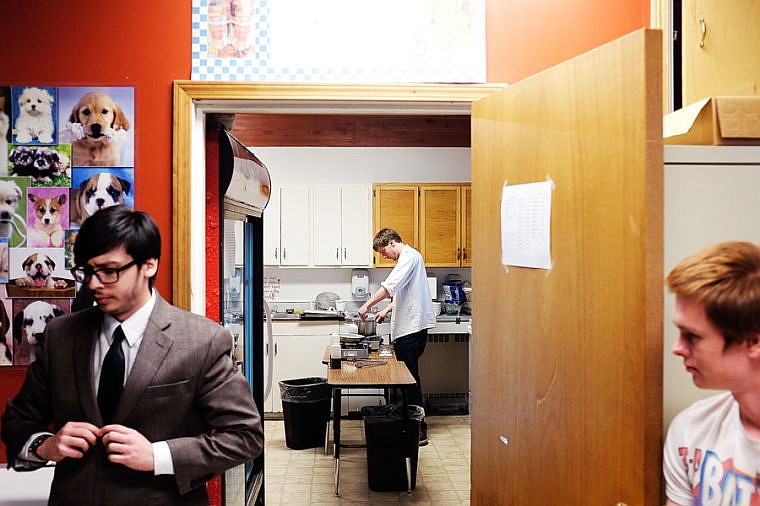 Former student Tyler Ferguson, center, prepares food while other students prepare to wait tables Friday night during Whitefish Independent High School formal inner. April 18, 2014 in Whitefish, Montana. (Patrick Cote/Daily Inter Lake)