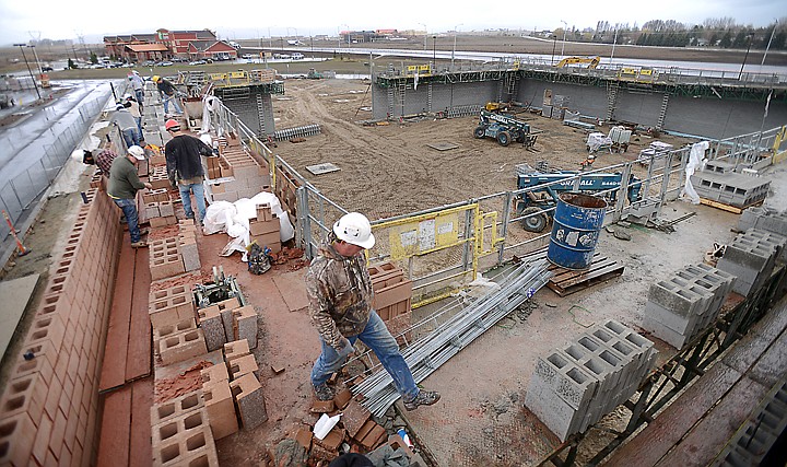 A crew from Swank Enterprises works Thursday on what will be the new Michaels store in phase three of the Spring Prairie shopping center in north Kalispell. This view looks down from the roof of the Cabela’s store. Four new stores are under construction: Ulta and Michaels on the west side of Cabela’s and Boot Barn and PetSmart to the east. Stores are expected to open this fall.