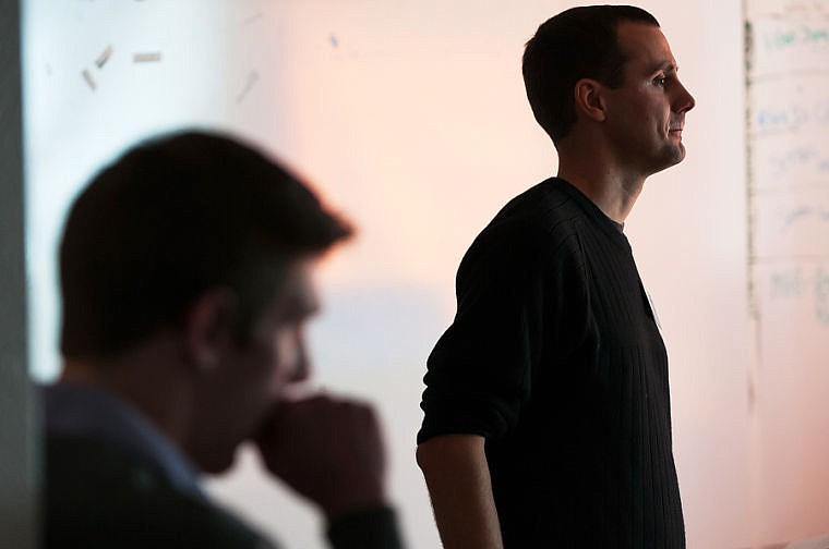 Montana State University students Mitch Yoder, right, and KyleLee Hall teach stress management techniques Friday morning to a health class at Flathead High School. April 25, 2014 in Kalispell, Montana. (Patrick Cote/Daily Inter Lake)