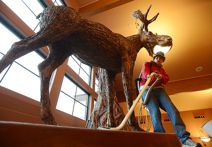 Spenser Eaton, 16, of Whitefish, and a long time volunteer with the Whitefish Theatre Company cleans up around the moose statue over the entry way of the O'Shaughnessy Center on Saturday, April 26, in Whitefish. (Brenda Ahearn/Daily Inter Lake)