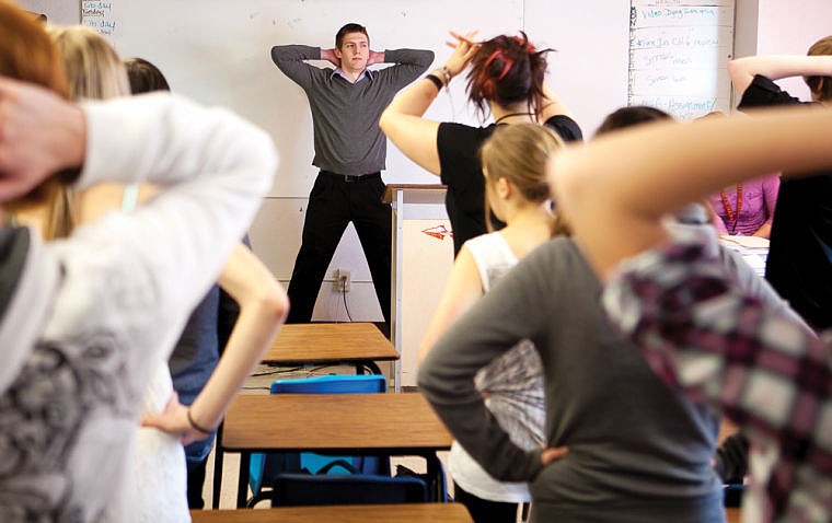 Montana State University student KyleLee Hall demonstrates power poses while teaching stress management techniques Friday morning to a health class at Flathead High School. April 25, 2014 in Kalispell, Montana. (Patrick Cote/Daily Inter Lake)