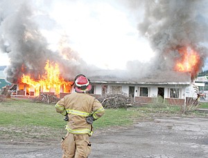 Fire Captain Steve Lauer watches as the flames quickly spread from one end of the building to the other. Lauer started the fire in the far left room.