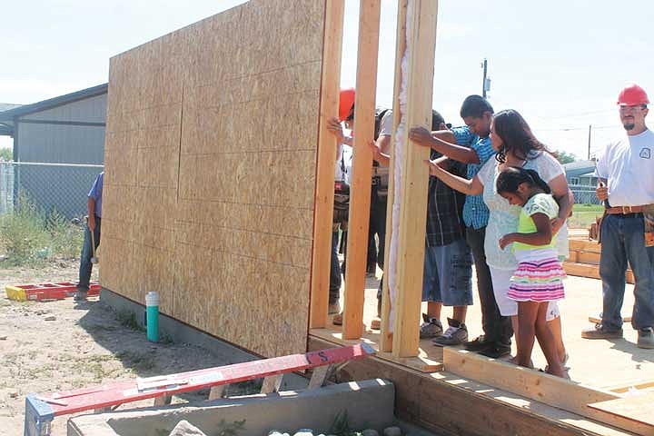 The exterior walls went up Thursday afternoon, meaning volunteers can now get to work on the inside of the house, Hall said.