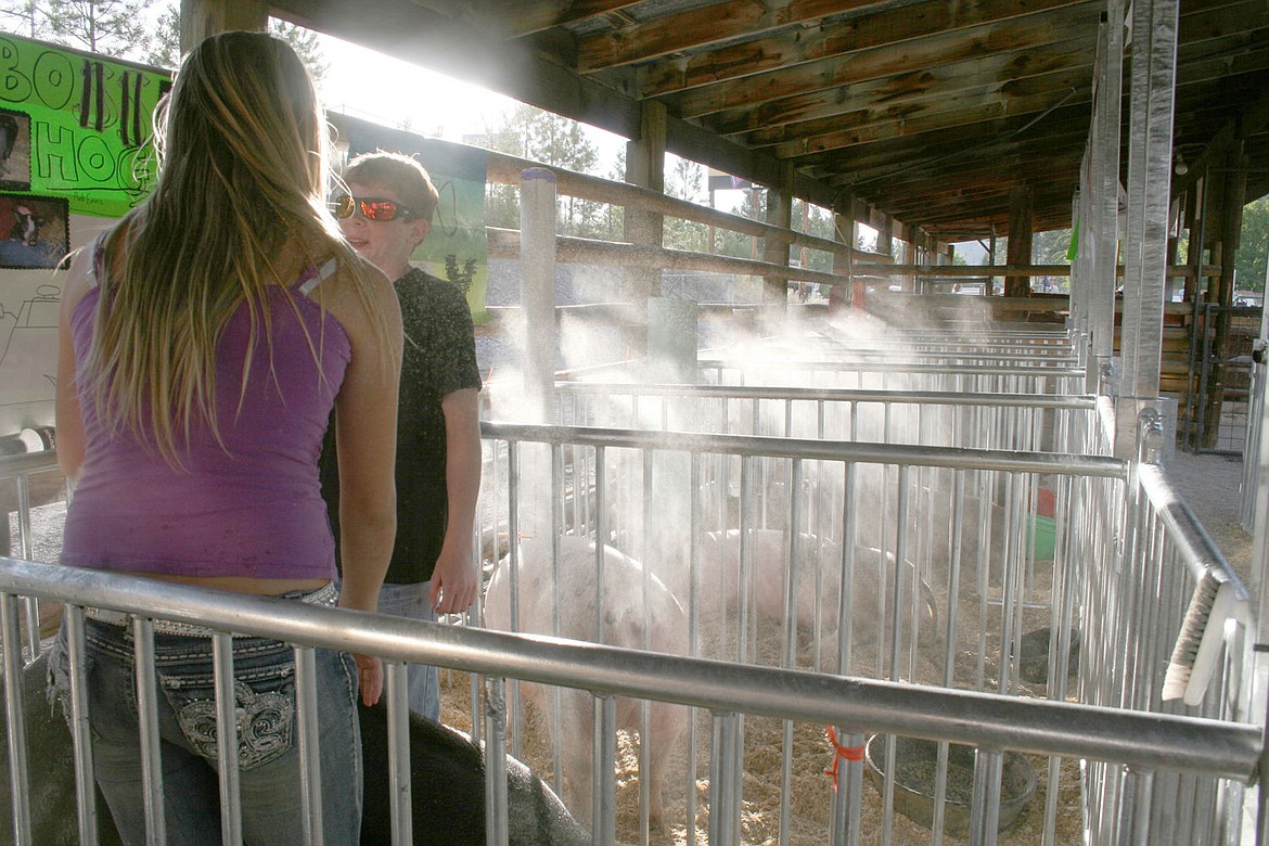 Emma Hill, left, and Logan Donally keep watch over the animals as the pigs in the background cool off under water mist.
