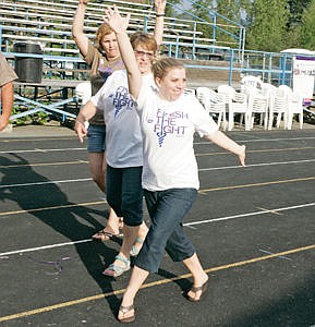 Ward Crushing team members Sara Grotjohn, front, Ann Grotjohn and Sydney Christopherson Ward "groove" to the music as they complete a lap Friday evening during Relay for Life 2014.