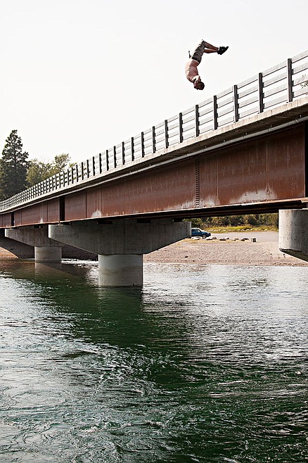 Caleb Edwards of Kalispell throws a backflip off the Holt Stage Road bridge into the Flathead River on Wednesday afternoon.