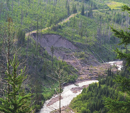 The slump, which ran down into Sullivan Creek, is about 3.5 miles west of the West Side Hungry Horse Reservoir Road. The forest road is gated and closed to motorized vehicles but open to hikers and mountain bikers. It’s an important route for hunters and berry pickers, Spotted Bear District Ranger Deb Mucklow said.