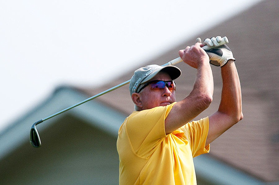 Brian Cripes of Whitefish watches his tee shot on Hole 16 Wednesday morning during the second round of the Montana State Senior Golf tournament at Village Greens Golf Club. Aug. 6, 2014 in Kalispell, Montana. (Patrick Cote/Daily Inter Lake)