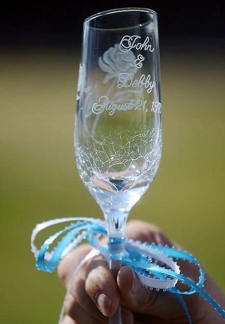 John Schaefer displays the personalized engraving on a piece by his wife Debby Schaefer at the Camp 9 Engraving booth on Friday, August 8, for the opening of Huckleberry Days in Depot Park in downtown Whitefish. The Schaefers are from Nordman, Idaho. (Brenda Ahearn/Daily Inter Lake)