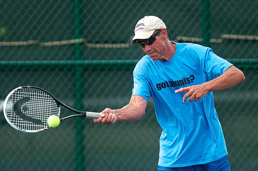Mark Cutler returns serve Friday evening during the Flathead Valley Open Tennis match at Flathead Valley Community College. Aug. 8, 2014 in Kalispell, Montana. (Patrick Cote/Daily Inter Lake)