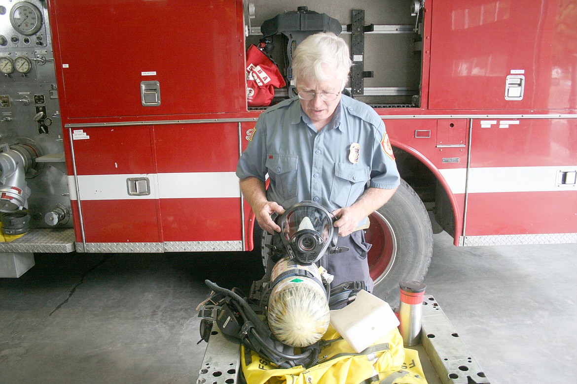 SVFD Chief John Woodland displays the old gear which will be replaced with much safe self-contained-breathing-apparatuses.