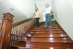 Hotel Libby's Gail Burger, left, and Barney Hammons review the finish work on the hotel's newly-refurbished grand staircase Friday morning.