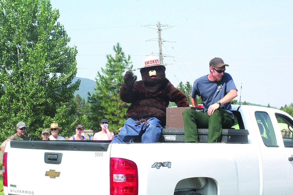 Smokey Bear waves to the crowd during the Huckleberry Festival's Parade in Trout Creek on Saturday. Smokey celebrated his 70th birthday at the ranger office in Plains on Friday.