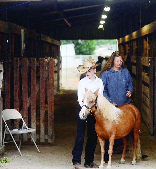 Kaj Haagerup, 11, of Kila, and his mother Wendy prepare Taffy for the Miniature Horse Judging on Thursday, August 14, at the Northwest Montana Fair in Kalispell. (Brenda Ahearn/Daily Inter Lake)
