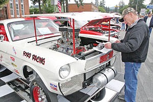 Libby's John Dinkins studies the build history on Rod Campbell's 1966 Ford Mustang gasser during Saturday's Ignite the Nites car show.