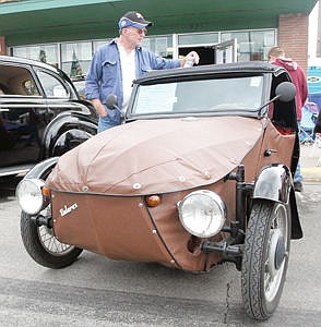 Ken Everett studies the history of the 1956 Velorex Oskar owned by Don Ennis of Bothell, Wash. The Velorex was manufactured in Czechoslovakia and weighs 720 pounds with a full tank of gas.