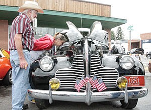 Jim and Laurie Hicks admire the 1940 Buick Special owned by Dave and Jerry Young of Eureka.
