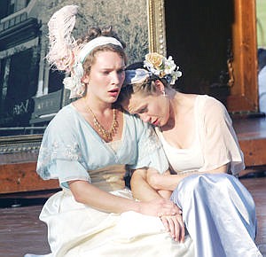 Best of friends and cousins Celia (Rebecca Hurd) left and Rosalind (Joanna Harmon) in Shakespeare in the Parks' "As You Like It" Sunday at Libby Elementary's amphitheater.