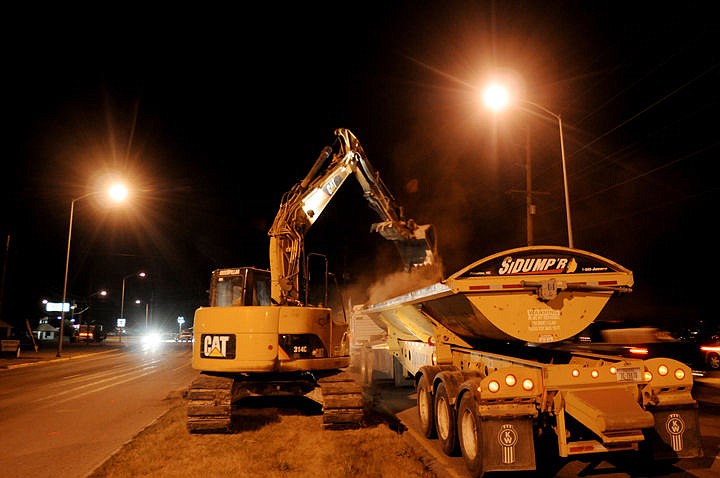 Construction crews work in the early hours of Thursday on a storm-water drainage project on U.S. 2 in Evergreen. Work hours are 9 p.m. to 6 a.m.; the project will continue through mid-November. (Brenda Ahearn/Daily Inter Lake)