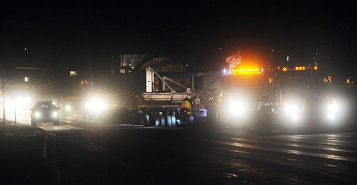 The megaload of oil-refinery equipment makes its way through Kalispell on U.S. 93 heading north as it passes Hutton Ranch Plaza just before midnight on Thursday.
