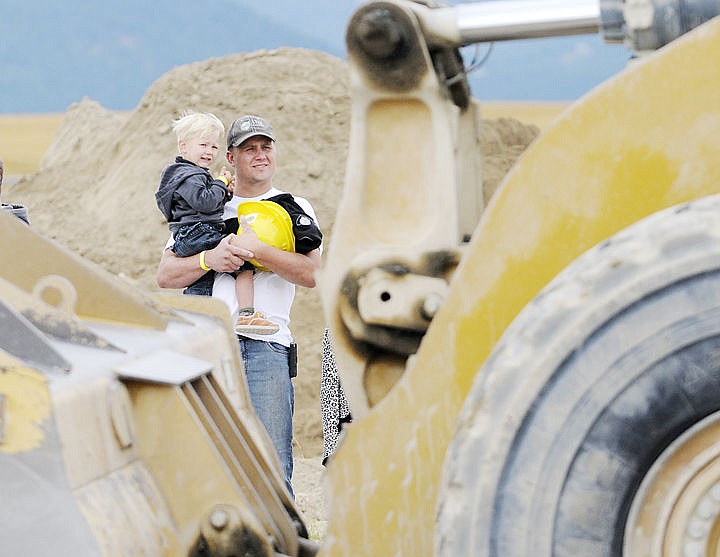 Jake Ek holds his son Vance, 2, as they watch his other son Reid,6, help drive a front end loader. (Aaric Bryan/Daily Inter Lake)