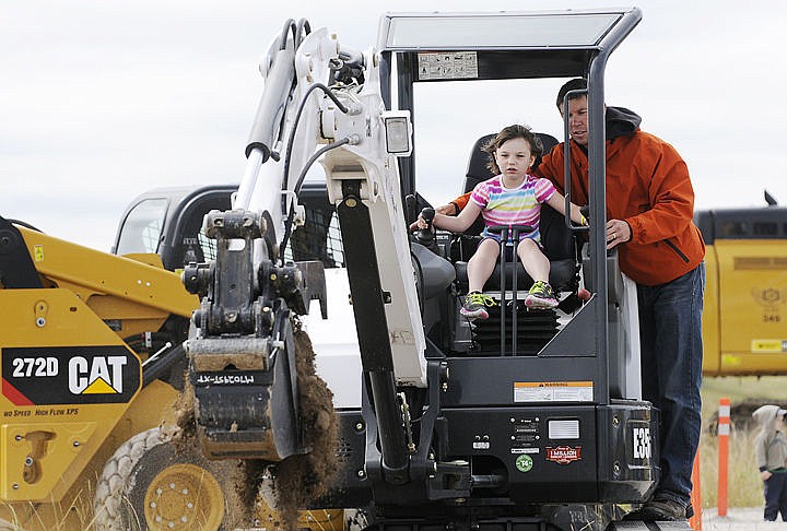 Blayke Shenefelt, 4, dumps a scoop of dirt with the help of Dan Hodge during Gravelpalooza. (Aaric Bryan/Daily Inter Lake)