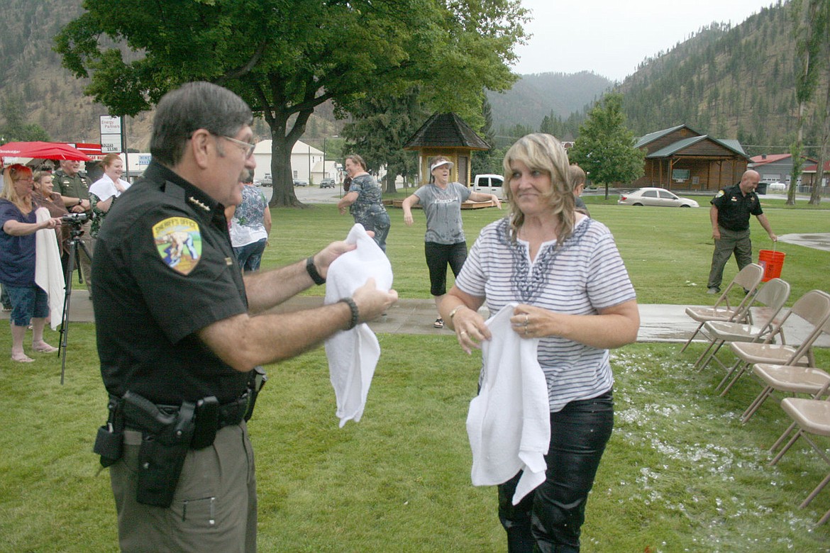 Mineral County Sheriff Ernie Ornelas hands a towel to Commissioner Laurie Johnston.
