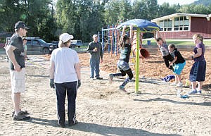 Kyran Kelso, Mazzie Hermes, Marcus Hermes and Sadie Peterson play on new equipment at the W.F. Morrison Elementary School as Superintendent Jacob Francom and other volunteers watch.