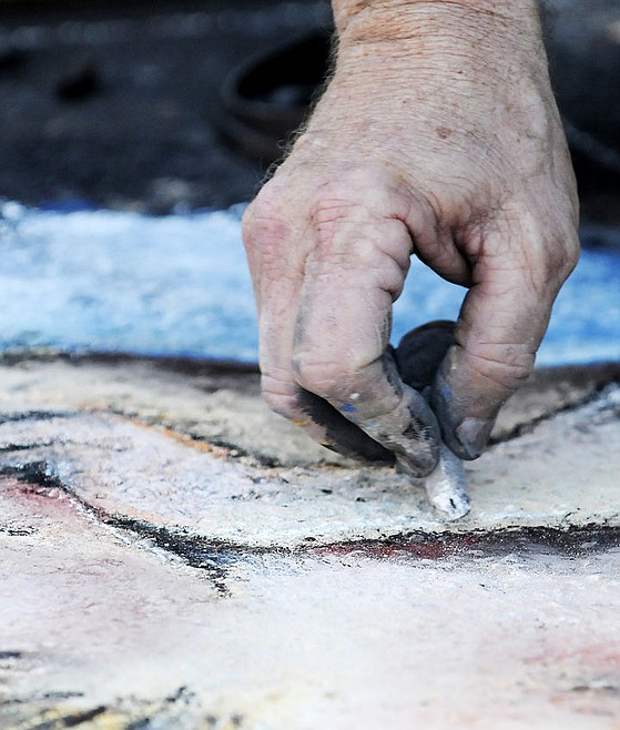 Bill Spiess draws an angel during a chalk art demonstration in Bigfork on Tuesday. (Aaric Bryan/Daily Inter Lake)
